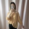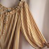 Bluzka ma poziome paski w dwóch kolorach: pomarańczowym i białym. Materiał jest lekki, dzięki czemu bluzka jest przewiewna i przyjemna na skórze. Dekolt jest typu „off-the-shoulder”, czyli odsłania ramiona i trochę górę pleców, co dodaje jej kobiecego i modnego charakteru. Rękawy są krótsze i luźne, a sama bluzka ma swobodny krój, który nie opina ciała.