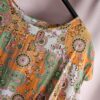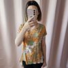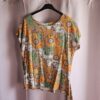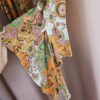 Bluzka ma krótki rękaw i wzór paisley w odcieniach pomarańczowego, zielonego i białego. Materiał jest lekki i przewiewny, idealny na cieplejsze dni. Bluzka jest w żywych kolorach i przyciąga uwagę, wprowadzając do stylizacji energię i pozytywność.