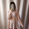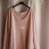 Sweter jest w pięknym, brzoskwiniowym kolorze, który wygląda bardzo świeżo i przyjemnie. Ma fakturę w postaci prążkowanego splotu, co daje mu charakteru i sprawia, że wygląda na bardziej interesujący. Krój jest dość luźny, z dekoltem w kształcie litery V, który subtelnie eksponuje szyję. Rękawy są długie, a po bokach ma rozcięcia, co dodaje mu lekkości.