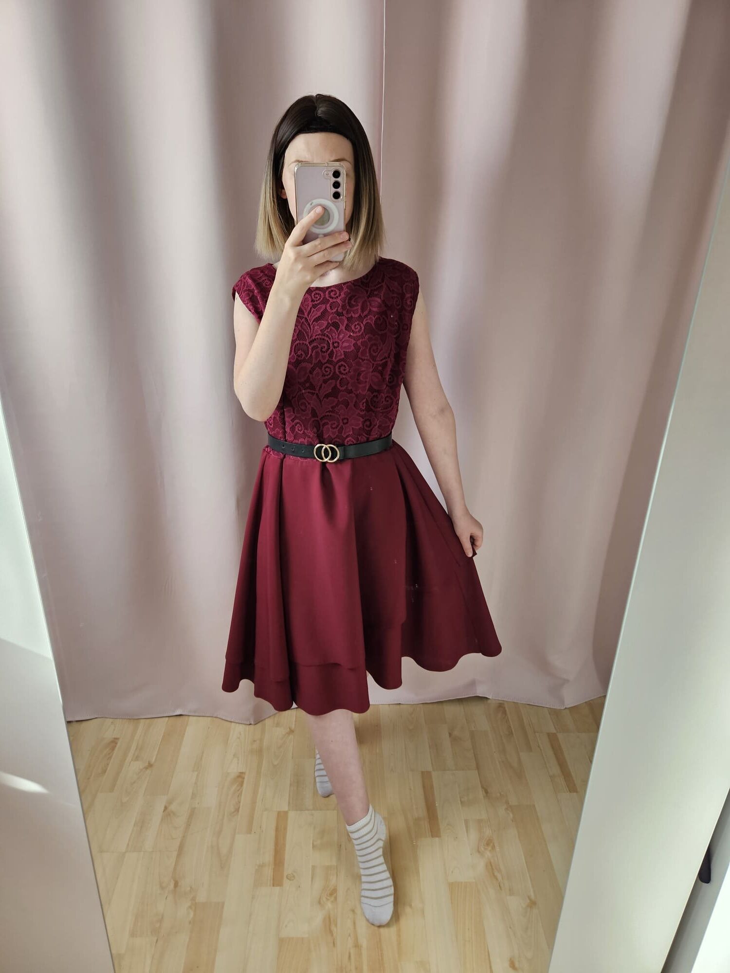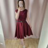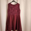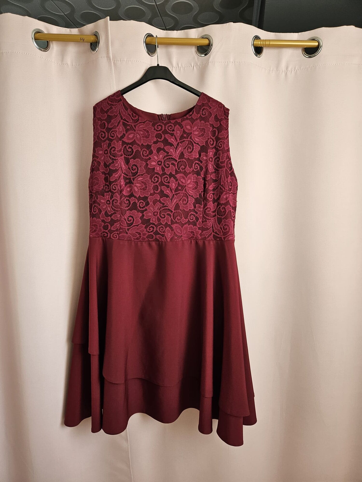 Sukienka ma głęboki bordowy kolor, który jest zarówno elegancki jak i wyrafinowany. Góra sukienki jest wykonana z delikatnej koronki, która dodaje jej subtelnego uroku i romantycznego charakteru. Spódnica sukienki jest warstwowa, co dodaje jej objętości i sprawia,że wygląda lekko i zwiewnie. Całość prezentuje się elegancko i ładnie podkreśla sylwetkę.