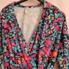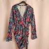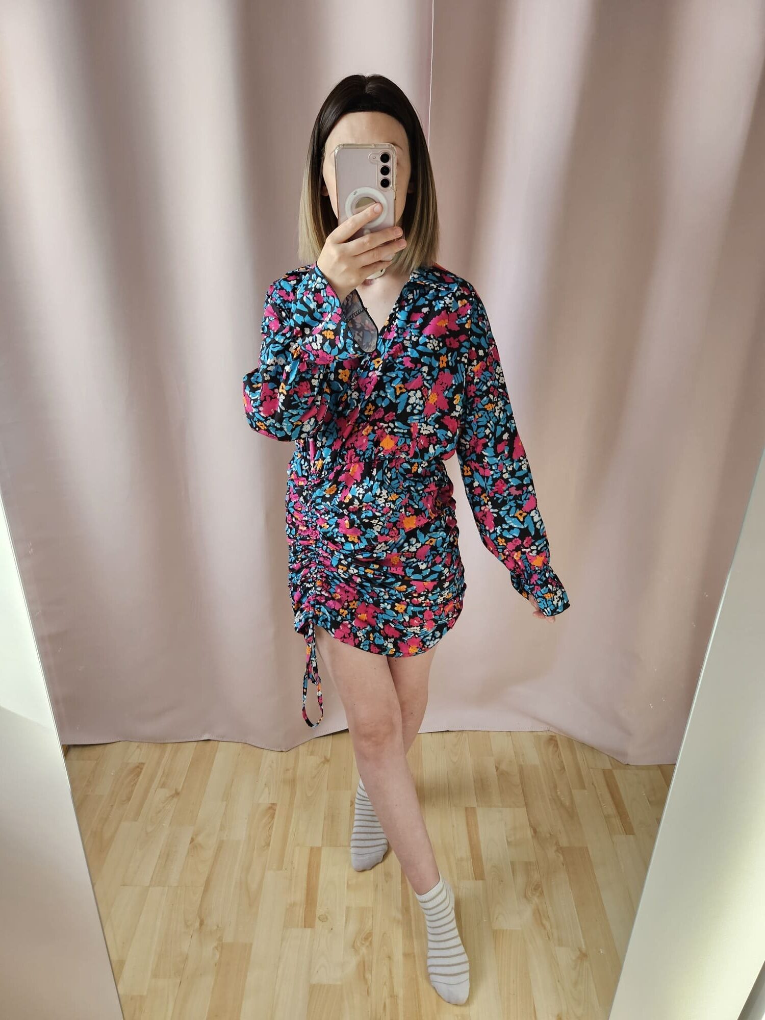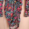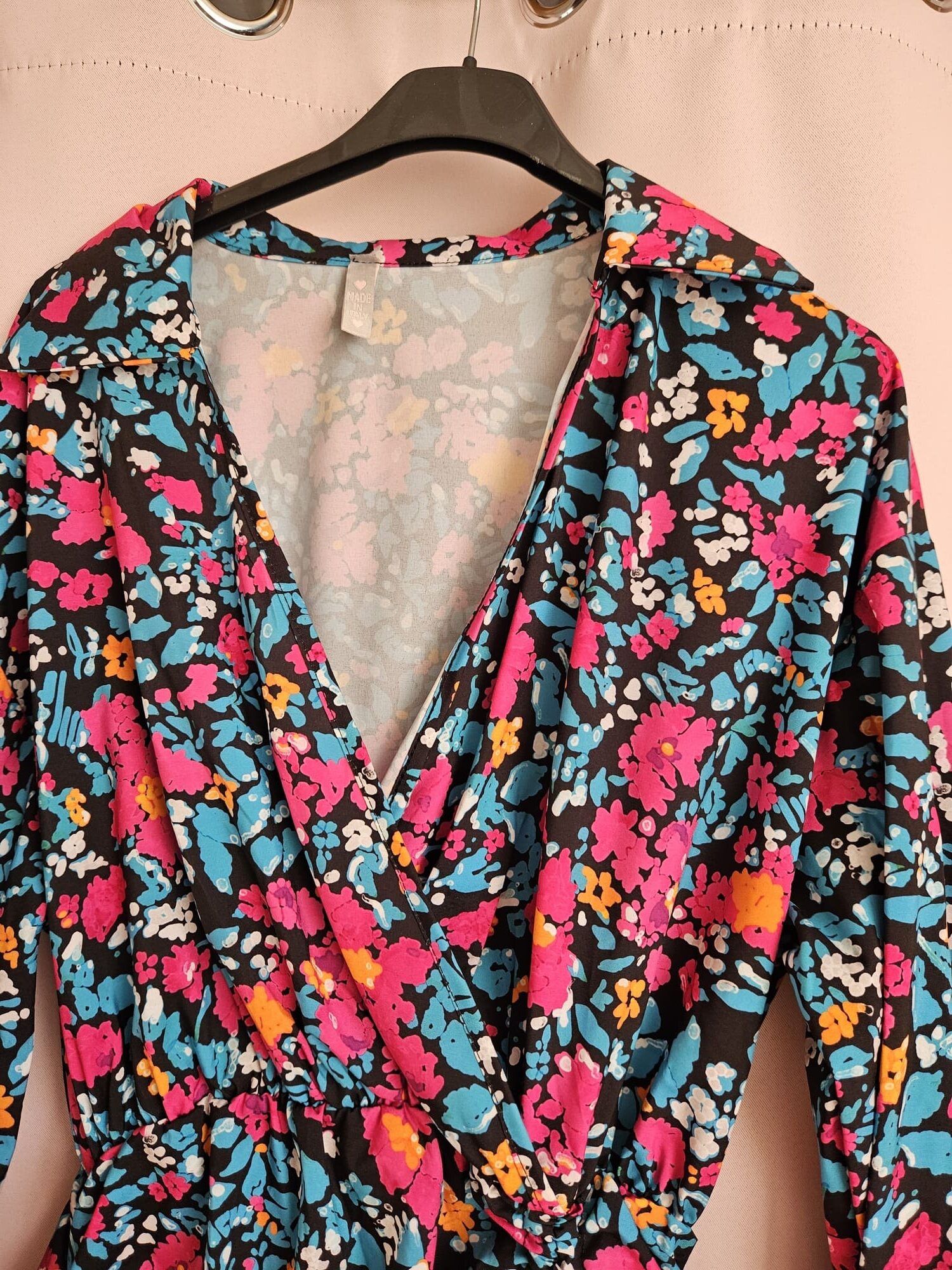 Sukienka ma długi rękaw i dekolt w kształcie litery V. Wzór jest bardzo kolorowy, z kwiatami w odcieniach różu, niebieskiego, pomarańczowego i żółtego na czarnym tle. Ma też marszczenia po bokach i na dole.