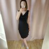 Sukienka jest w kolorze głębokiej czerni, co dodaję jej elegancji i uniwersalności. Dekolt typu „wodospadu” dodaje jej szyku, a zdobienia z koralików na ramionach przyciągają wzrok. Dół sukienki składa się z warstw, a plecy mają dekolt w kształcie łódki. Całość prezentuje się bardzo kobieco.