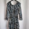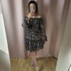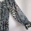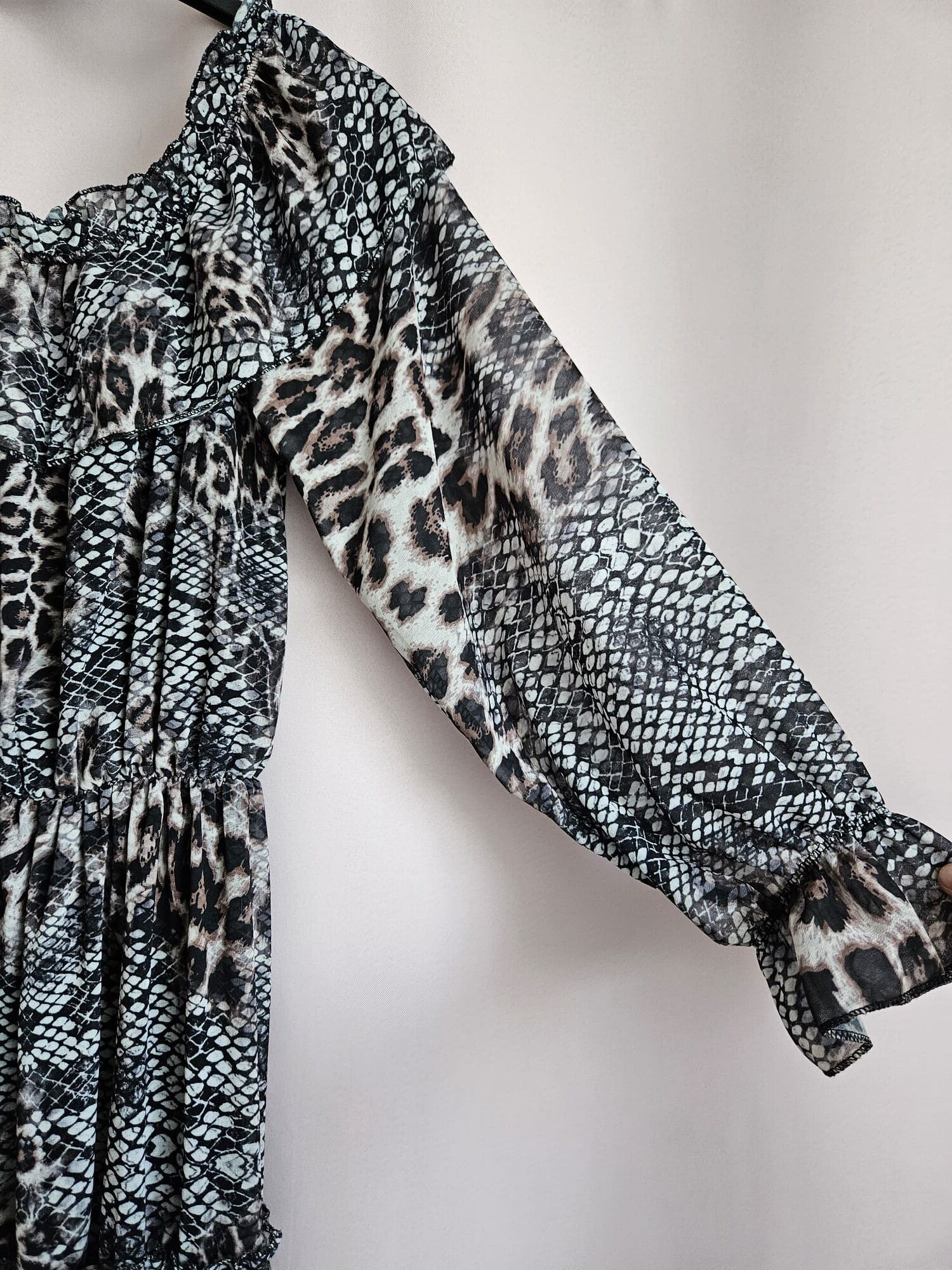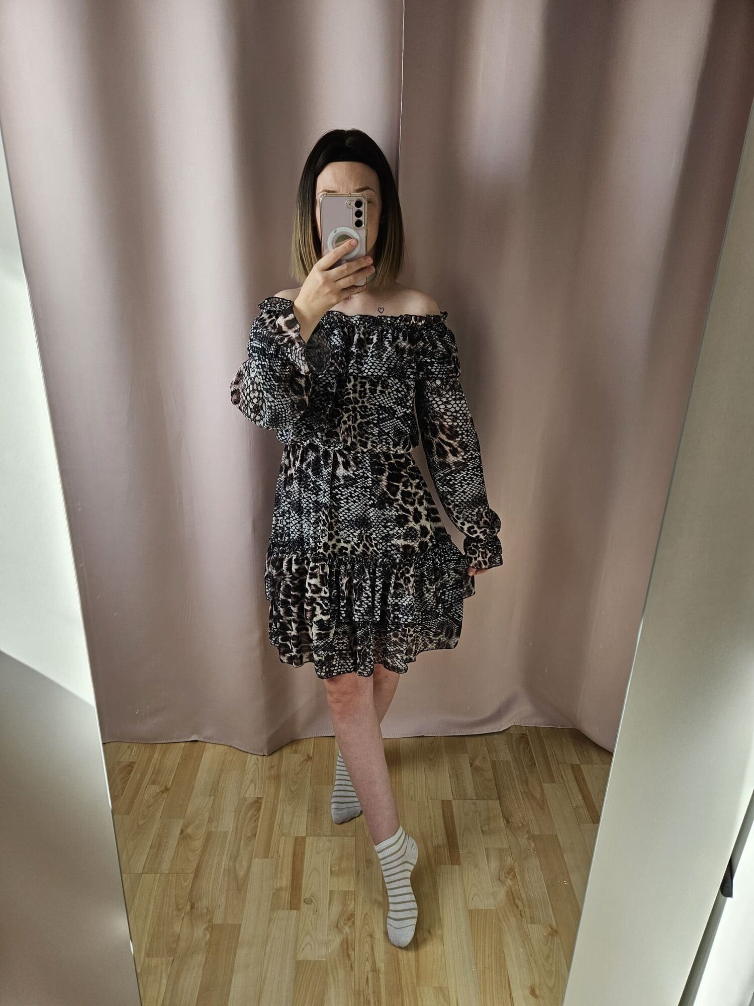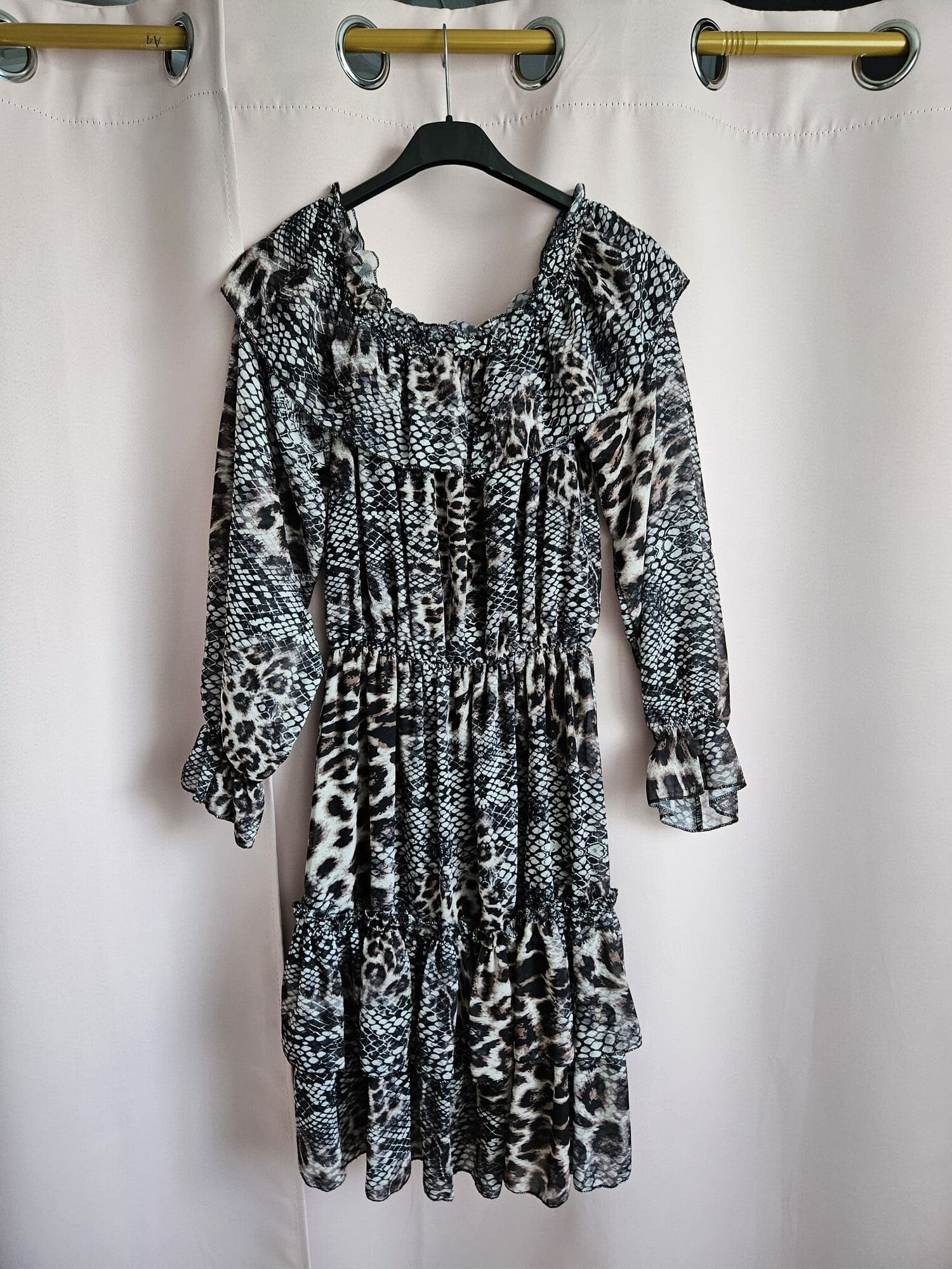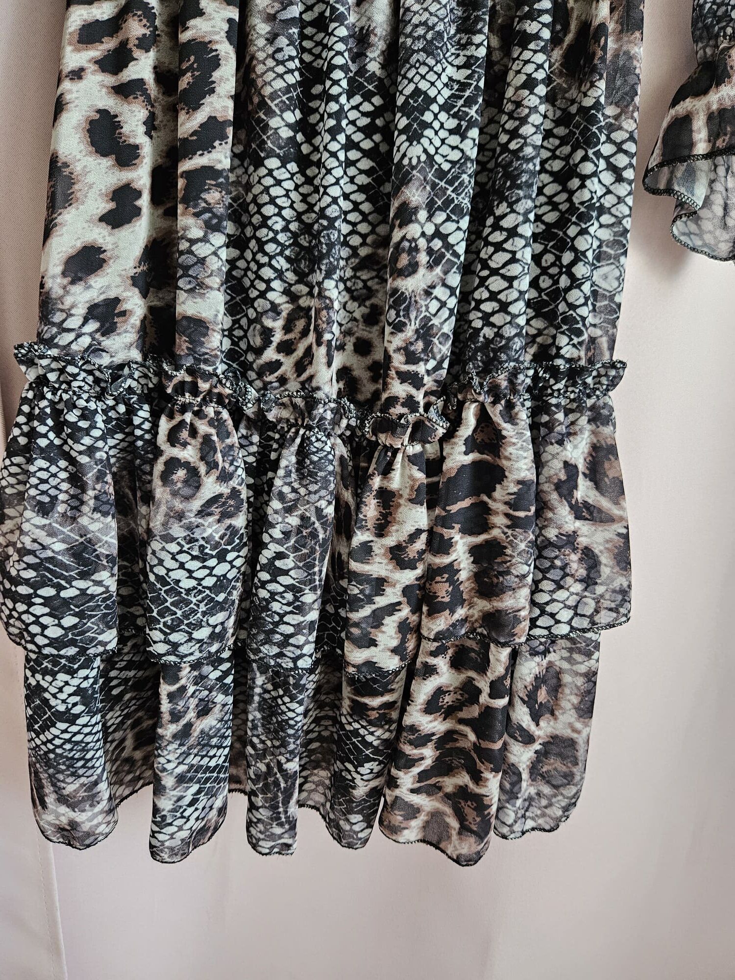 Sukienka z odkrytymi ramionami łączy w sobie dwa zwierzęce wzory: panterkę i skórę węża, co nadaje jej unikalny i odważny wygląd. Długie rękawy równoważą krótki fason, czyniąc ją odpowiednią na różne okazje. Warstwowe falbany dodają sukience lekkości i dynamiki. Sukienka prezentuję się bardzo stylowo i nowocześnie.